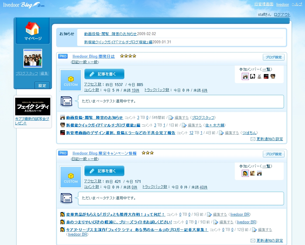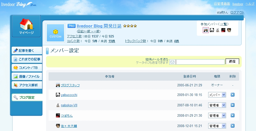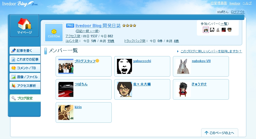 この作業が完了すると、今後はメインのlivedoor IDでほぼ投稿かカスタマイズまですべての操作が行えるようになり、訪問者数やコメント数なども一覧できるようになります