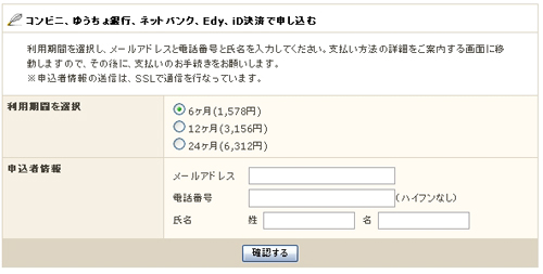画面にてお客様の「利用期間を選択」と「申込者情報」を入力し、画面下部「確認する」をクリック