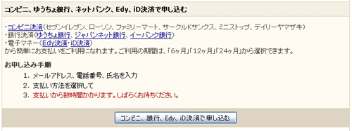 各有料プラン詳細ページの画面下部にある「コンビニ、ゆうちょ銀行、ネットバンク、Edy、iD決済で申し込む」欄にあるボタンをクリック