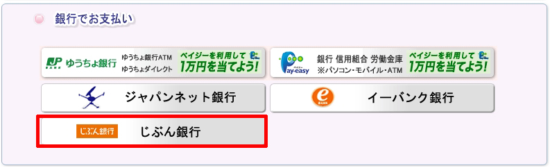 次に支払い方法選択画面が表示れますので、ここで じぶん銀行 を選択してください。
