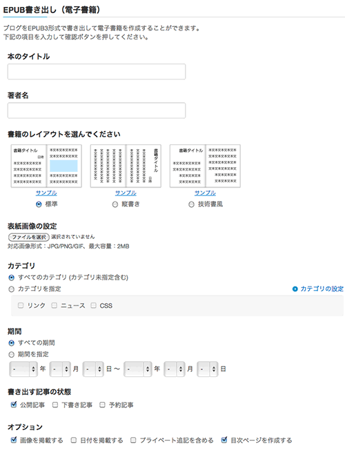 ・ライブドアブログで、電子書籍。 - EPUB / 縦書き / Kindle対応EPUB書き出し機能 設定画面