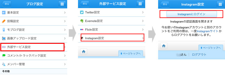 1. まず、スマートフォン版のマイページを開いて、ブログ設定 >外部サービス設定> Instagram設定>「Instagramにログイン」をタップしてください。