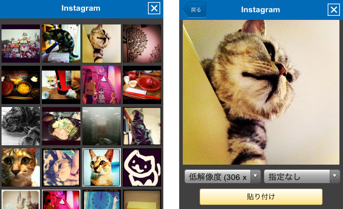 6. ボタンをクリックするとInstagram画像一覧が表示されるので、選択すると記事に挿入できます。