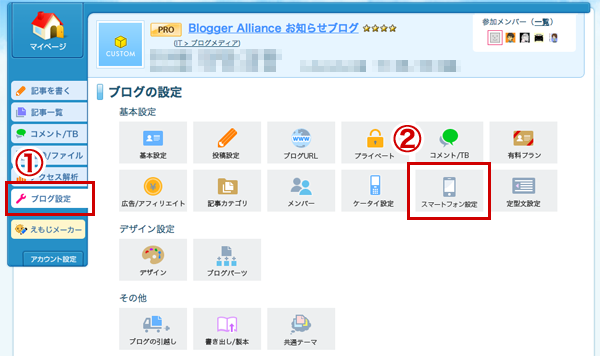 - PC版管理ページのブログ設定から「スマートフォン設定」を選択します。