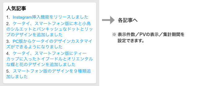 ブログの中で人気記事を表示します。表示件数/集計期間/PVの表示を個別に設定できます。