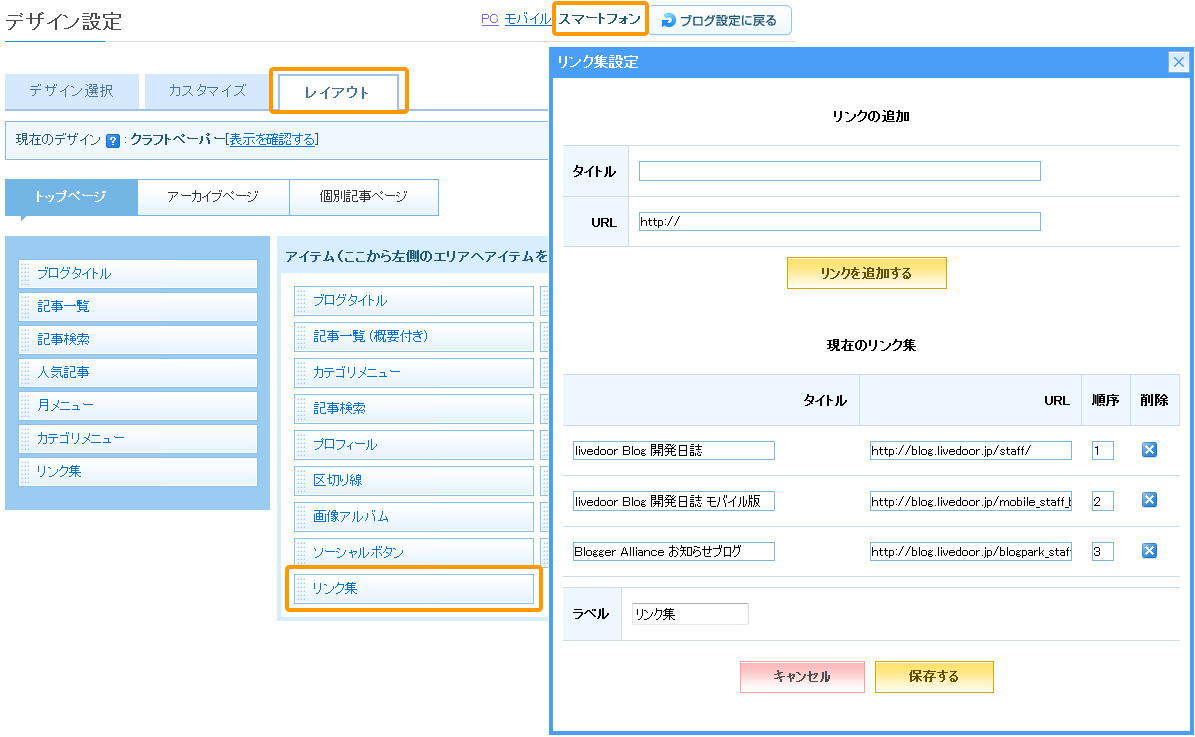 ブログ設定 > デザイン / ブログパーツ設定 > スマートフォン > レイアウト