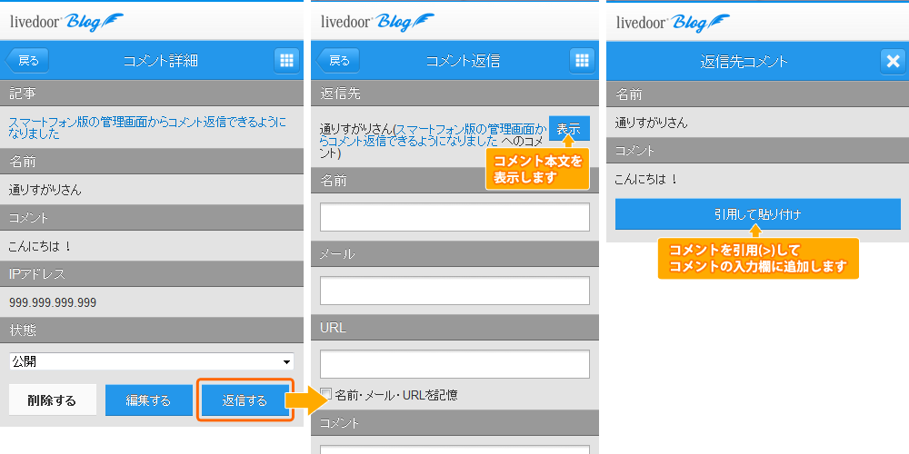 コメント本文を引用したり、コメントの公開/非公開設定ができ、外出先でブログにコメントが付いた時にこちらの機能で直ぐに返信することができます。