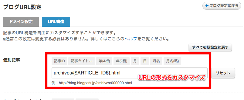 ブログの個別記事や各種アーカイブページのURLの形式を編集・設定する機能です。