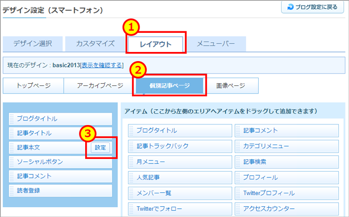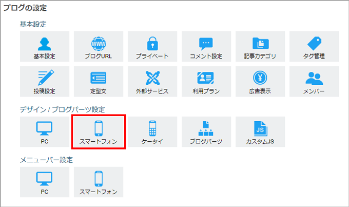 1.ブログ設定にあるデザイン / ブログパーツ設定の「スマートフォン」をクリック
