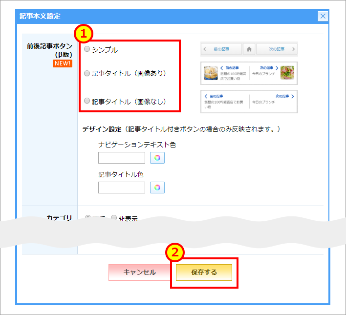 ブログ記事の下部にある前後記事ボタンに、タイトルとサムネイルを表示できるようになりました。