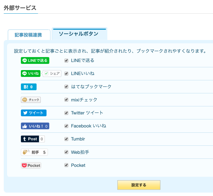 ブログ設定 > 外部サービス > ソーシャルボタン から設定を行えます。