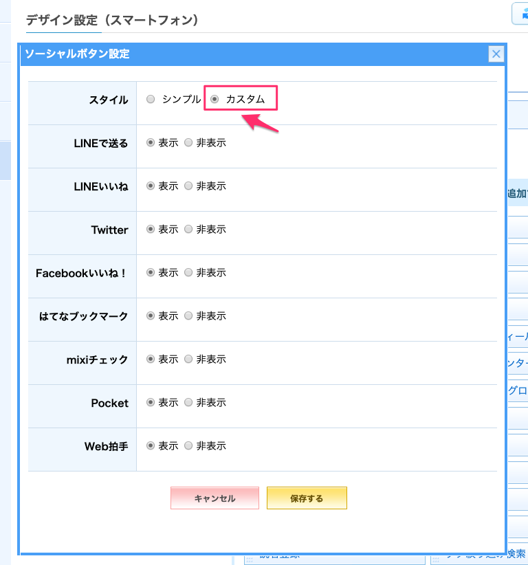 2) 「カスタム」を選択すると、各ソーシャルボタンの設定が行えます。表示させたいボタンを選択してください。