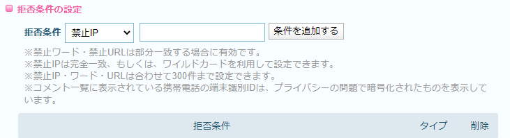 ブログ設定 > コメント設定 > 拒否条件の設定 にて禁止ワードの条件の追加時
