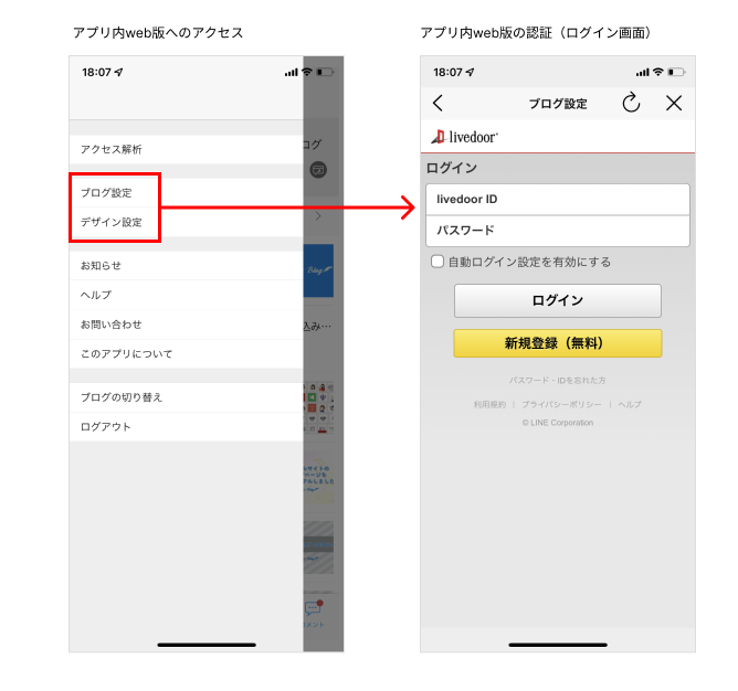 投稿アプリへログインした後に、「ブログ設定」及び「デザイン設定」へアクセスする際に求められるログインのことです。