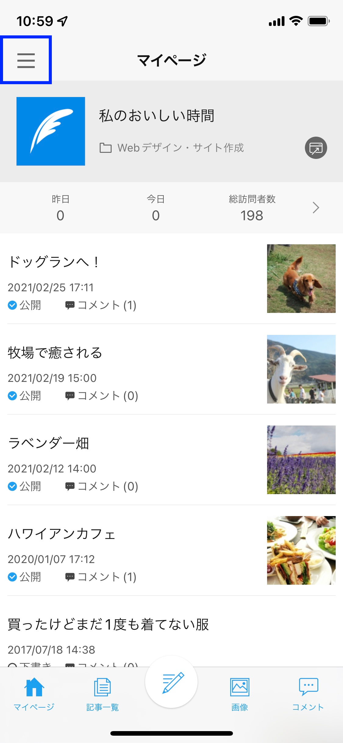 1. 投稿アプリにログインし、左上の三本線をタップしてメニューを開きます