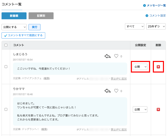コメントの公開設定・削除の方法