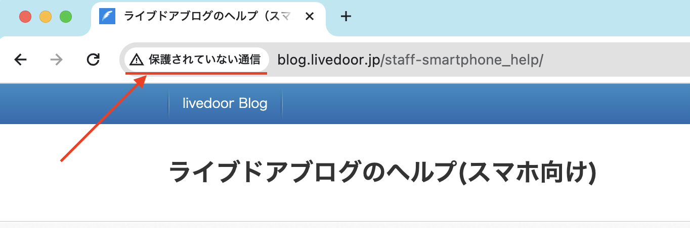 HTTPは、ブログを閲覧する際、Google Chromeなどのブラウザで「保護されていない通信」と表示し、HTTPS配信への切替を促しています。